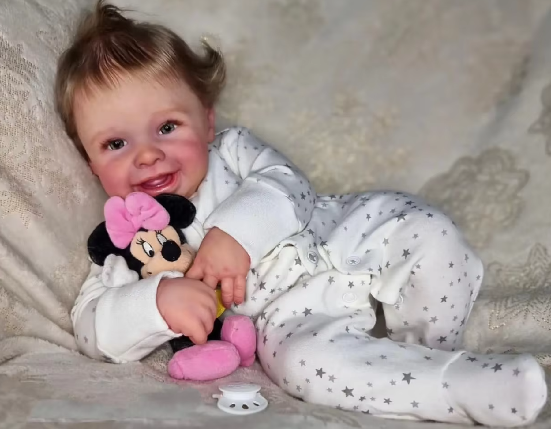 Meet Millie Joy, a 22-inch (55 cm) smiling reborn baby girl who brings sunshine into every home. With her gentle expression, sparkling blue eyes, and hand-rooted baby-soft hair, Millie is more than a doll — she’s a delightful companion full of warmth and charm.